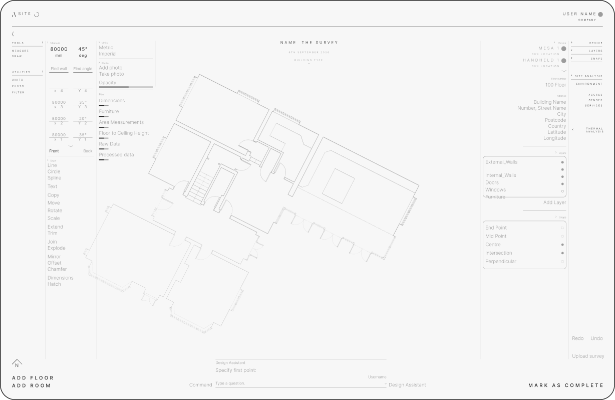 The Site App seamlessly integrates with our advanced autonomous survey robots. The app allows for easy export of data in various file formats for CAD tools. Secure cloud storage enables real-time access, fostering seamless collaboration across project teams. Streamlining the entire site survey process, the Site App provides precise solutions for all your surveying and planning needs.
